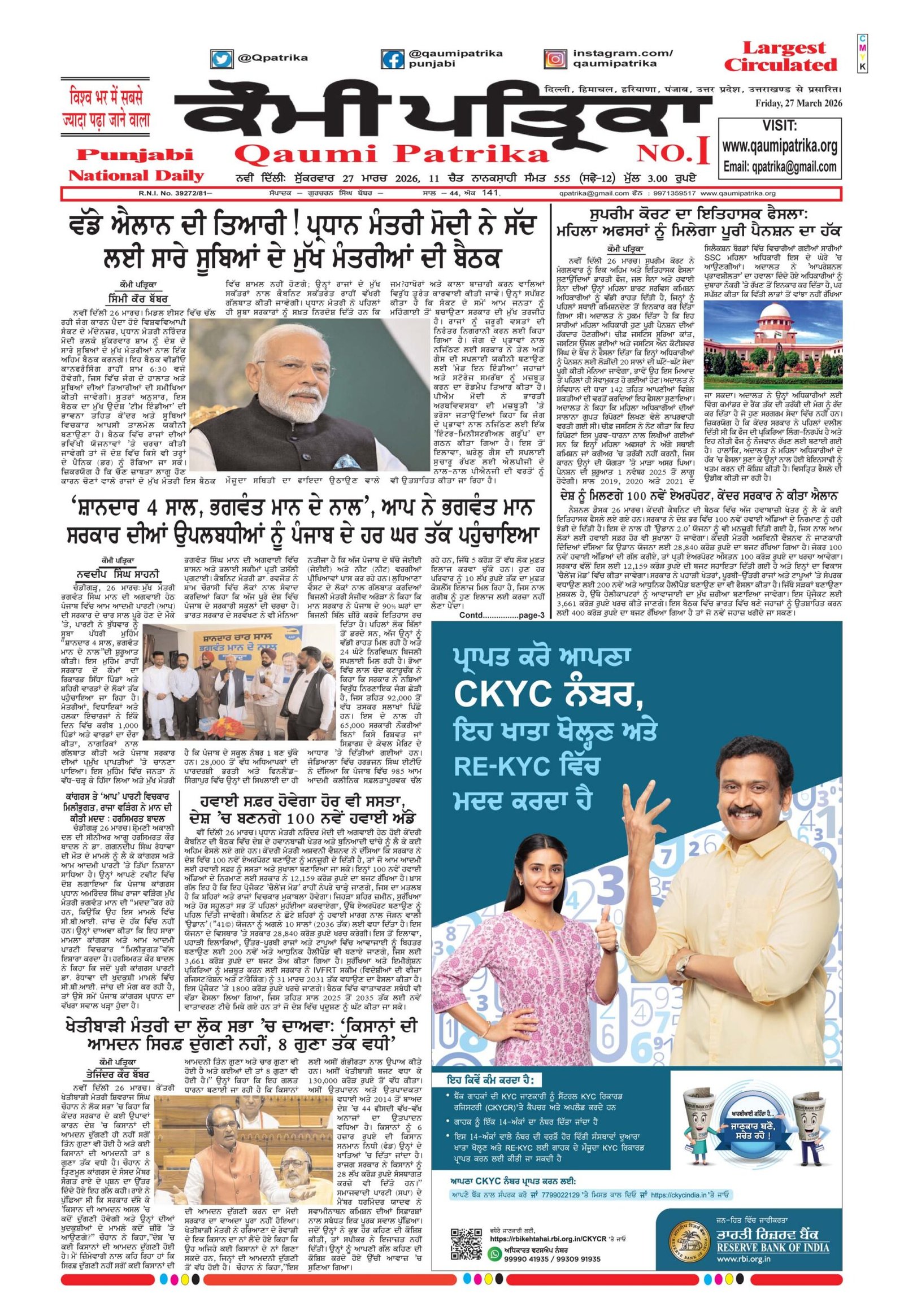 Qaumi Patrika Punjabi, 27 March 2026